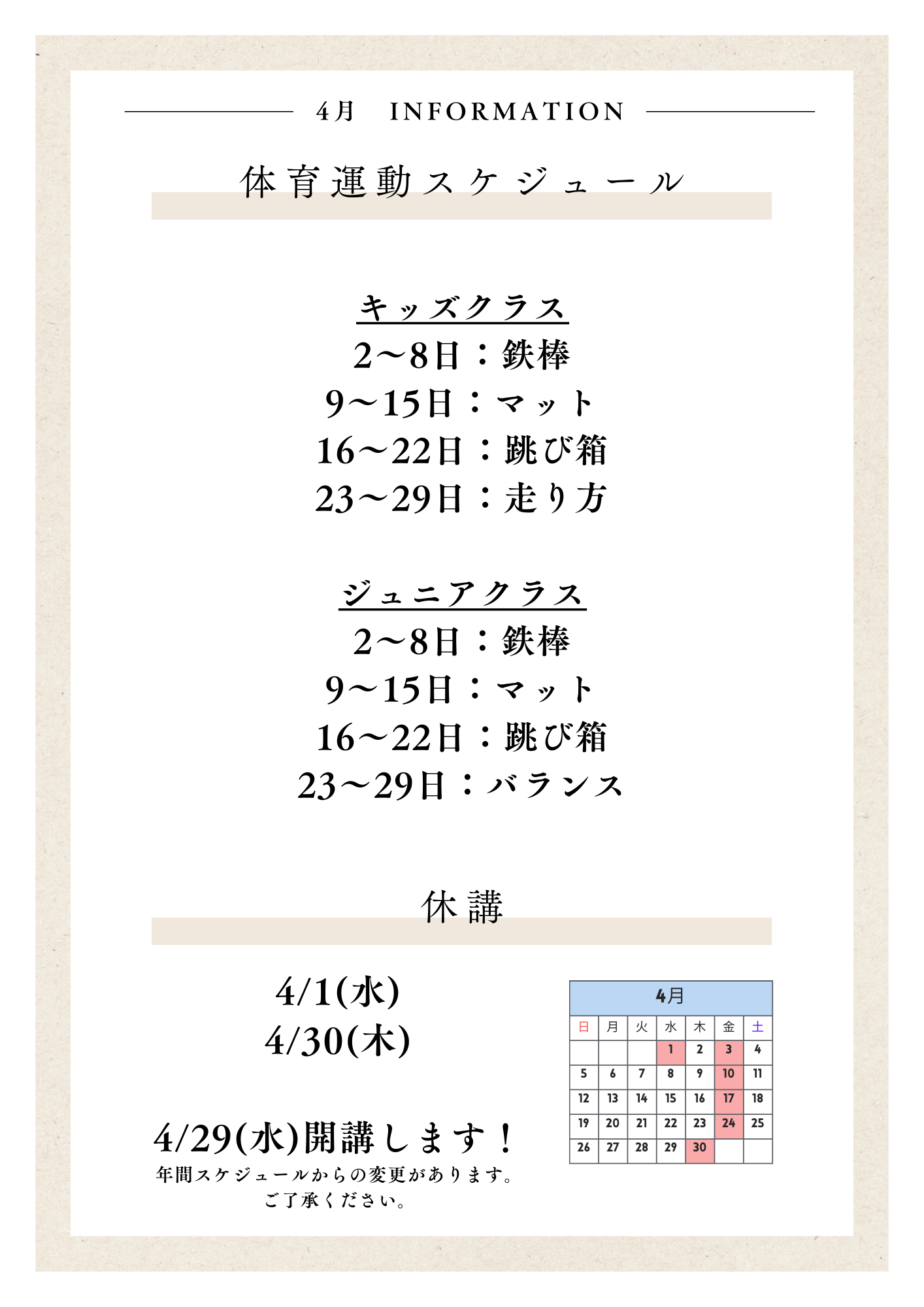 4月のレッスンスケジュールと休講のお知らせです。